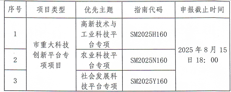 為推動我市市級重大科技創(chuàng)新平臺建設(shè),提升創(chuàng)新平臺服務(wù)產(chǎn)業(yè)鏈能力,根據(jù)我市重大科技創(chuàng)新平臺建設(shè)工作部署,決定開展2025年度市級重大科技創(chuàng)新平臺科研專項項目申報工作,現(xiàn)將有關(guān)事項通知如下: